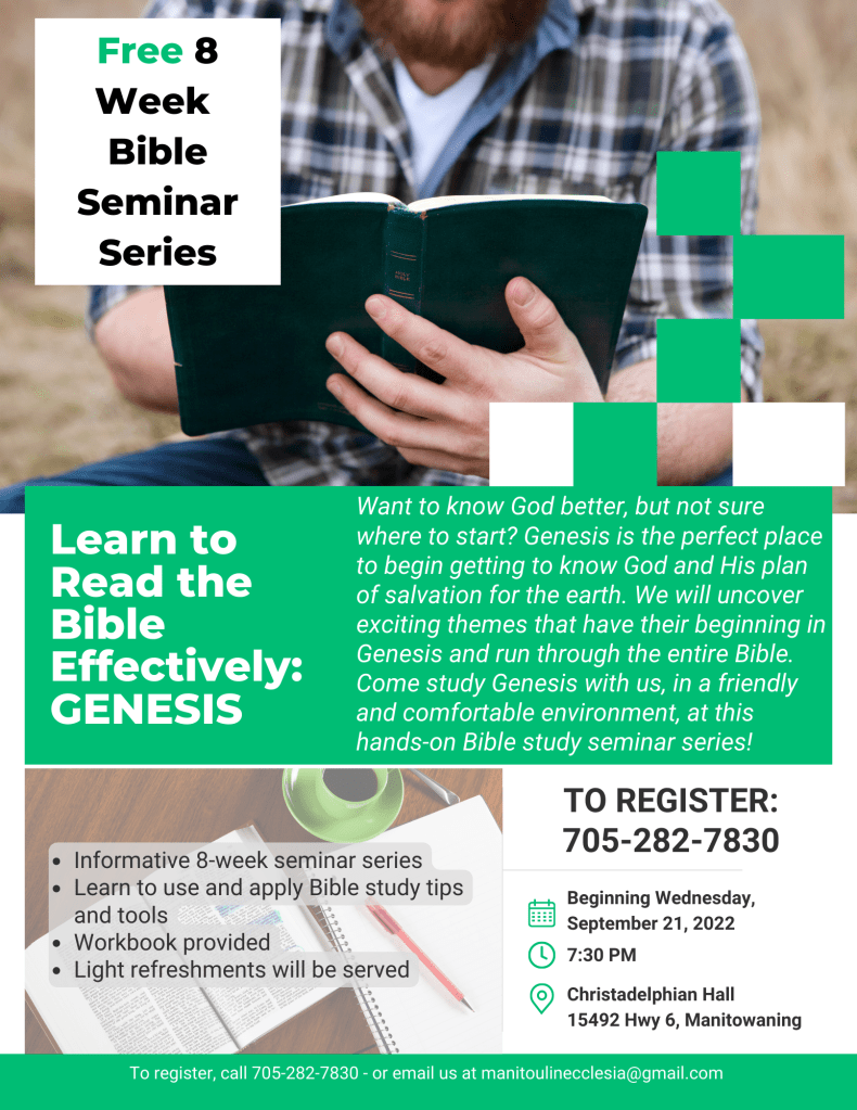 Join the Christadelphians of Manitoulin for a free Bible seminar. This informative 8 week program begins Wednesday, September 21 at 7:30 – and will take an in-depth look at the book of Genesis – and equip you with the tools you need to study the Bible on your own! A workbook will be provided, and light refreshments served.
